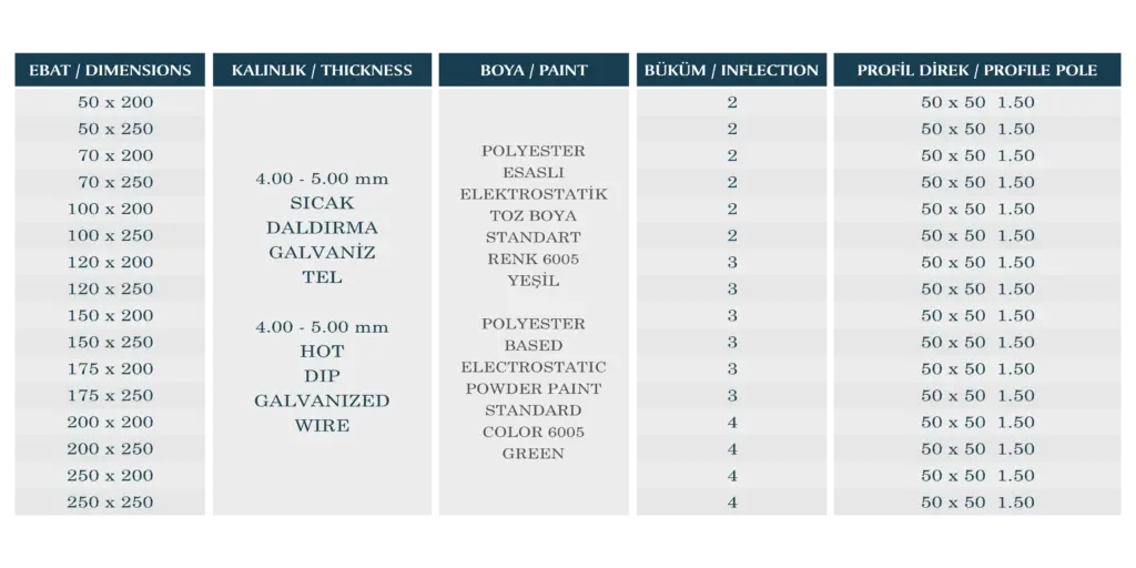 Panel ograda i stubovi se izrađuju u najpogodnijem dijelu protiv korozije. Panel ograda i stubovi se proizvode od vruće pocinkovane žice i profila, a boja na bazi poliestera se nanosi elektrostatičkim sistemom pečenja. Ekonomičan je, siguran, moderan i dugotrajan, proizveden od visoko kvalitetnog materijala. Vrlo je otporan na hrđu i promjenu boje, Osim sigurnosti, stvara graničnu zavjesu koja svojom dekorativnom strukturom daje prestiž i estetiku vašim zgradama.